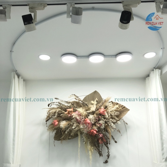 Trong bài viết này, mẫu rèm thay đồ studio được lắp ray vòm trực tiếp lên trần, kéo nhẹ nhàng và êm. Mẫu ray này tiết kiệm chi phí hơn so với sử dụng khung vòm bắt tường, chỉ phù hợp cho chiều cao trần nhà dưới 3m.