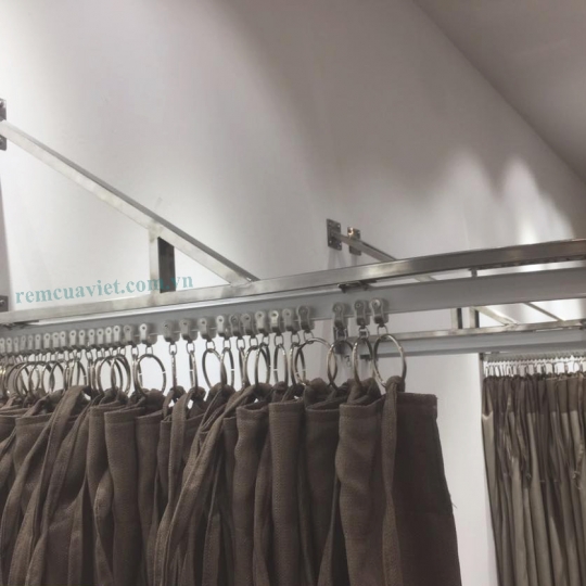 Mẫu rèm thay đồ này phù hợp cho shop có chiều cao vừa hoặc thấp (dưới 2,6m), sử dụng hệ ray nhôm uốn cong hình tròn, hình vòm, hình vuông, hình chữ nhật hoặc bất cứ đường nào dựa theo địa thế lăp đặt làm khung thử đồ. Vải sẽ được may xếp ly móc vào ray kéo nhẹ tay và êm.