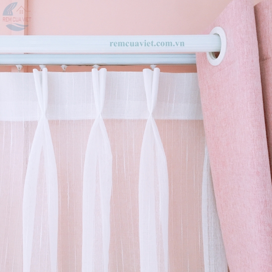 Màn vải 2 lớp màu hồng được thiết kế từ 1 lớp vải gấm hoặc bố màu hồng với chỉ sổ cản sáng từ 85-100% và lớp voan trắng trơn hoặc họa tiết nhẹ làm nền nổi bật lên màu hồng của lớp vải.