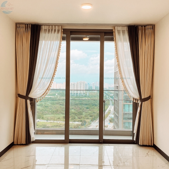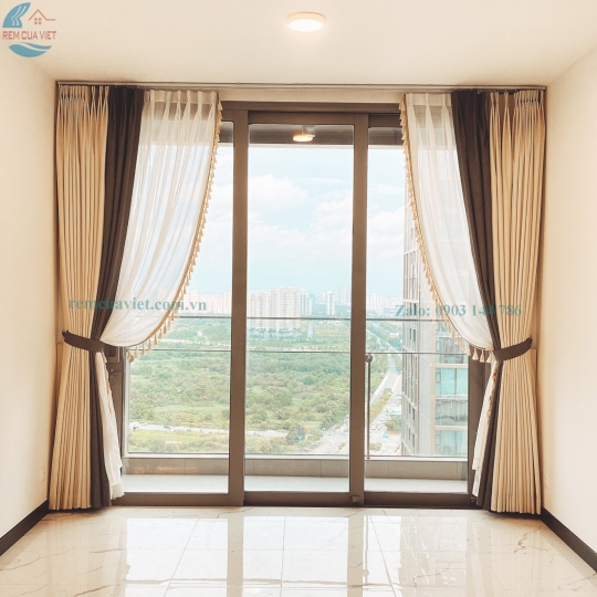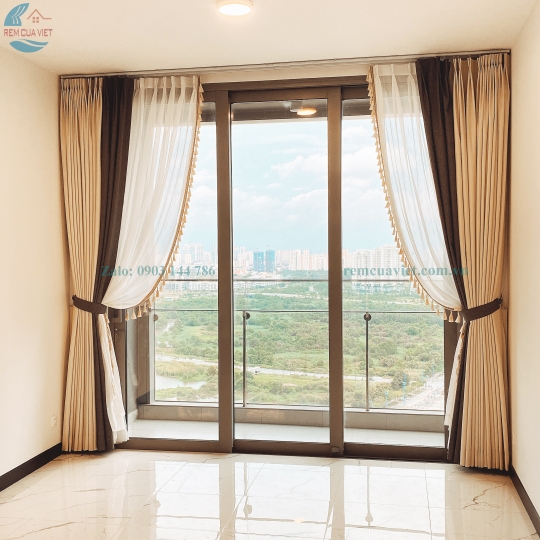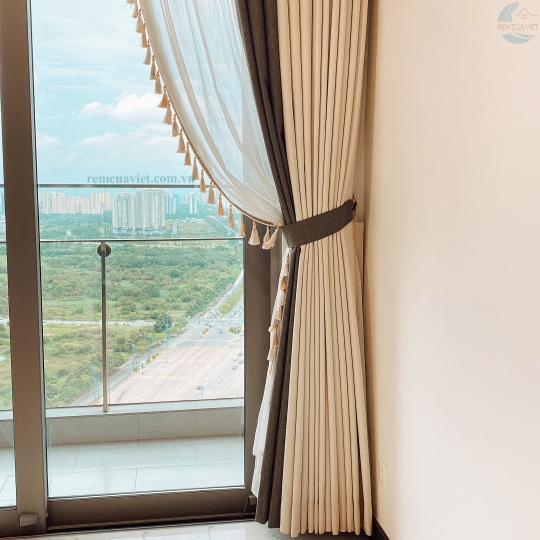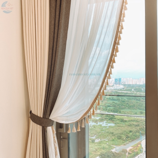 Lớp rèm vải voan trắng làm nền tôn lên lớp vải cao cấp được nhấn nhẹ bằng tua rua trắng-kem nhẹ nhàng càng làm tăng nét riêng cho phòng khách gia chủ.