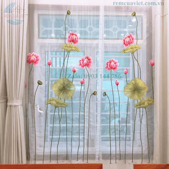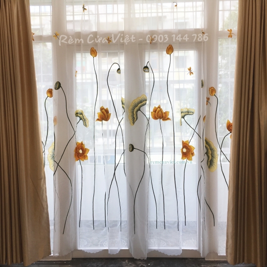 Rèm vải 2 lớp phòng khách thêu sen-cò